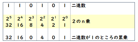 2進数で「1」となっているケタの累乗の数字を書き出します。