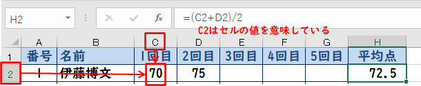 上の例で設定されている式「(C2+D2)/2」は、C2とD2の数値を足して2で割るという意味になります。