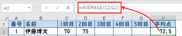 | AVERAGE | 平均を計算 | =AVERAGE(C2:E2) | C2からE2の平均を計算 |